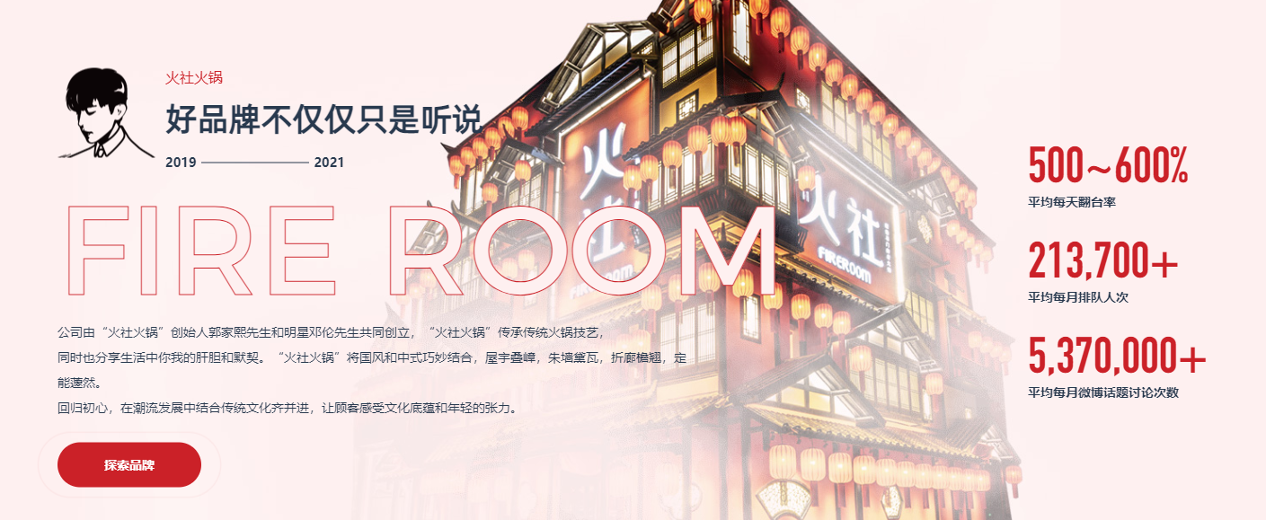 許多想要加盟火社品牌的加盟商往往會(huì)比較重視一個(gè)品牌的運(yùn)營(yíng)、盈利能力,而人們對(duì)于數(shù)字的敏感度遠(yuǎn)高于其他文字,所以在本次網(wǎng)站建設(shè)的時(shí)候,我們特意把火社品牌的每天翻臺(tái)率、每月排隊(duì)人次、微博話題討論次數(shù)數(shù)據(jù)展示出來(lái),體現(xiàn)品牌的可持續(xù)能力。