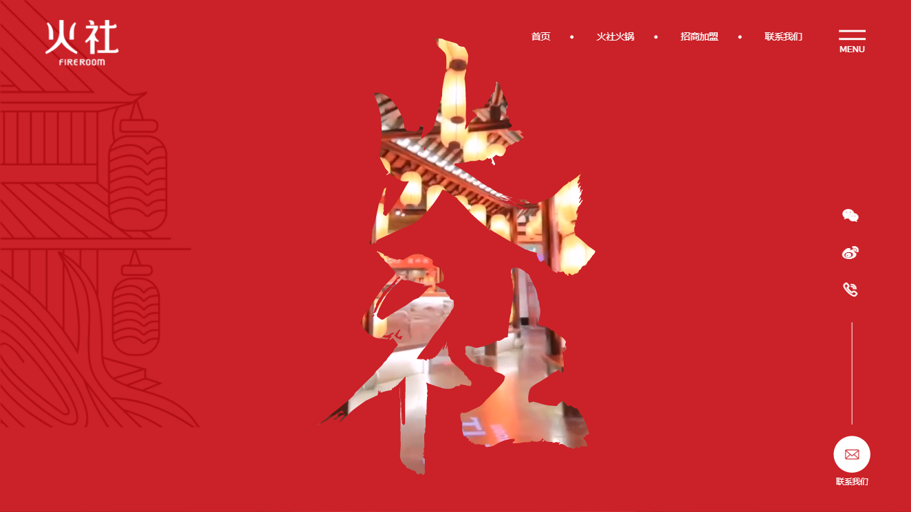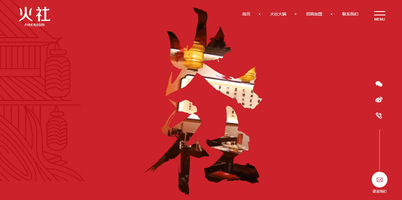 (整個(gè)首頁(yè)作為品牌宣傳頁(yè)面,突出火社火鍋品牌,一下就讓用戶的視覺(jué)聚焦,沒(méi)有其他多余的元素干擾↑)