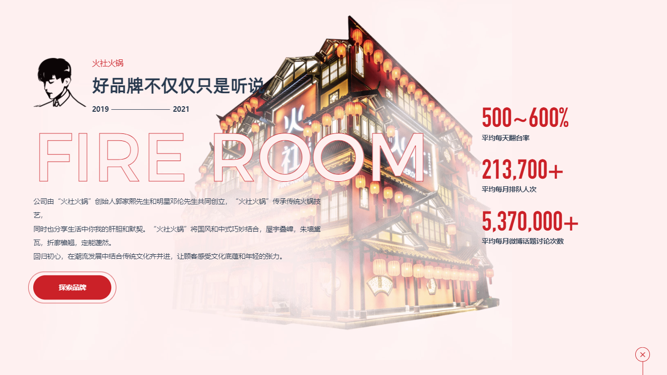 (我們將火社火鍋旗艦店的輪廓摳出來(lái),融合在整個(gè)背景里面,在不干擾用戶閱讀品牌介紹和關(guān)鍵數(shù)據(jù)的同時(shí),讓門(mén)店線下的裝修風(fēng)格和線上網(wǎng)頁(yè)達(dá)到一個(gè)契合↑)
