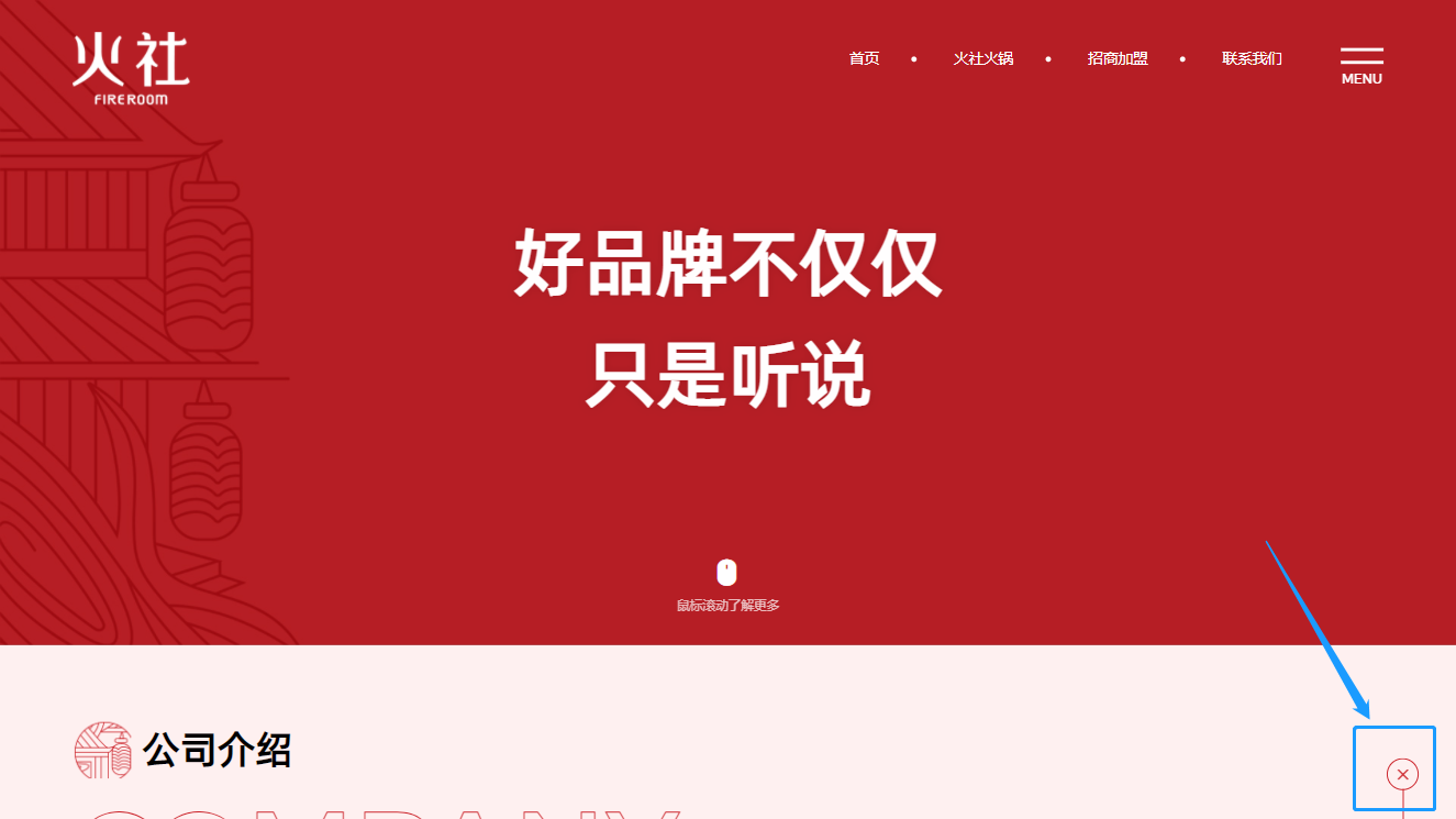 (愛(ài)蜀美極度注重用戶瀏覽網(wǎng)頁(yè)的舒適度和不被打擾性,非常反感一些營(yíng)銷(xiāo)工具的強(qiáng)制彈窗、反復(fù)彈出、狗皮膏藥似的占滿屏幕的四周,只保留必要的咨詢通道。所以我們只在網(wǎng)頁(yè)底部加入了一個(gè)加盟窗口,用戶可以隨時(shí)收縮/打開(kāi)窗口,在尊重用戶體驗(yàn)感的情況下,也體現(xiàn)了火社火鍋把服務(wù)放在首位的品牌理念↑)
